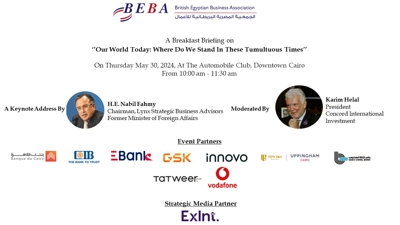 The British Egyptian Business Association (BEBA) has organised on Thursday a breakfast briefing in honour of H.E. Nabil Fahmy, Chairman of LYNX Strategic Business Advisors and Former Minister of Foreign Affairs, at Automobile and Touring Club of Egypt.