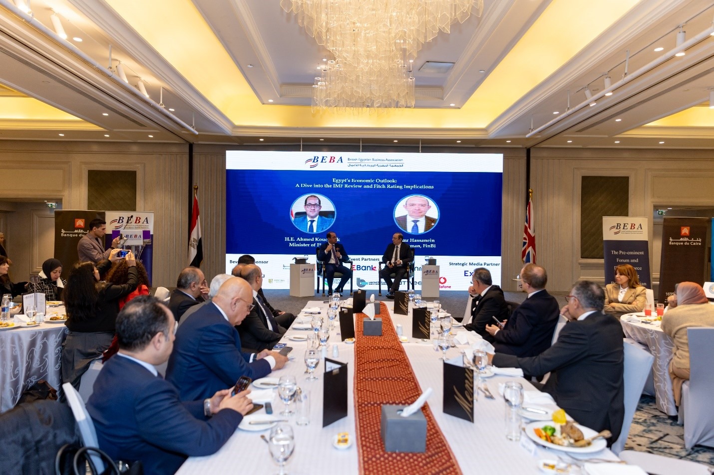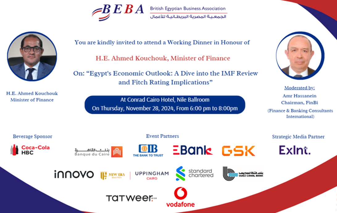 Cairo, November 28, 2024: BEBA hosted a working dinner in honour of H.E. Ahmed Kouchouk, Egypt’s Minister of Finance, focusing on the country’s economic outlook. The event delved into several key topics, particularly the International Monetary Fund (IMF) review, implications of Fitch’s credit rating, fiscal consolidation, and Egypt’s fiscal policy reforms. The conversation explored the government’s efforts to foster confidence in the economy, improve tax systems, support private sector growth, manage debt, and meet targets for inflation control.
