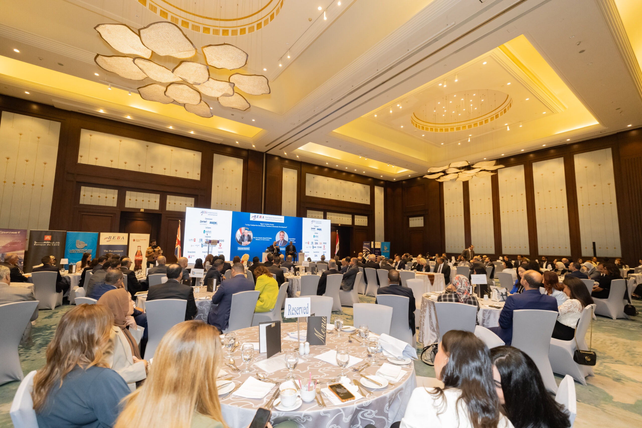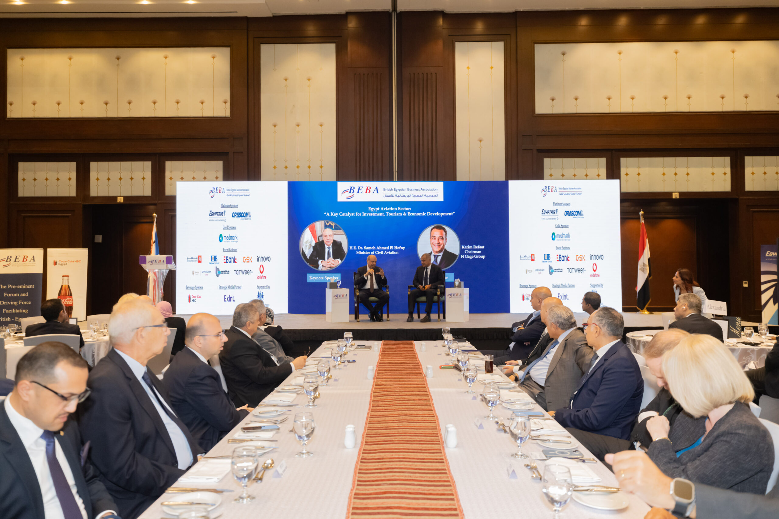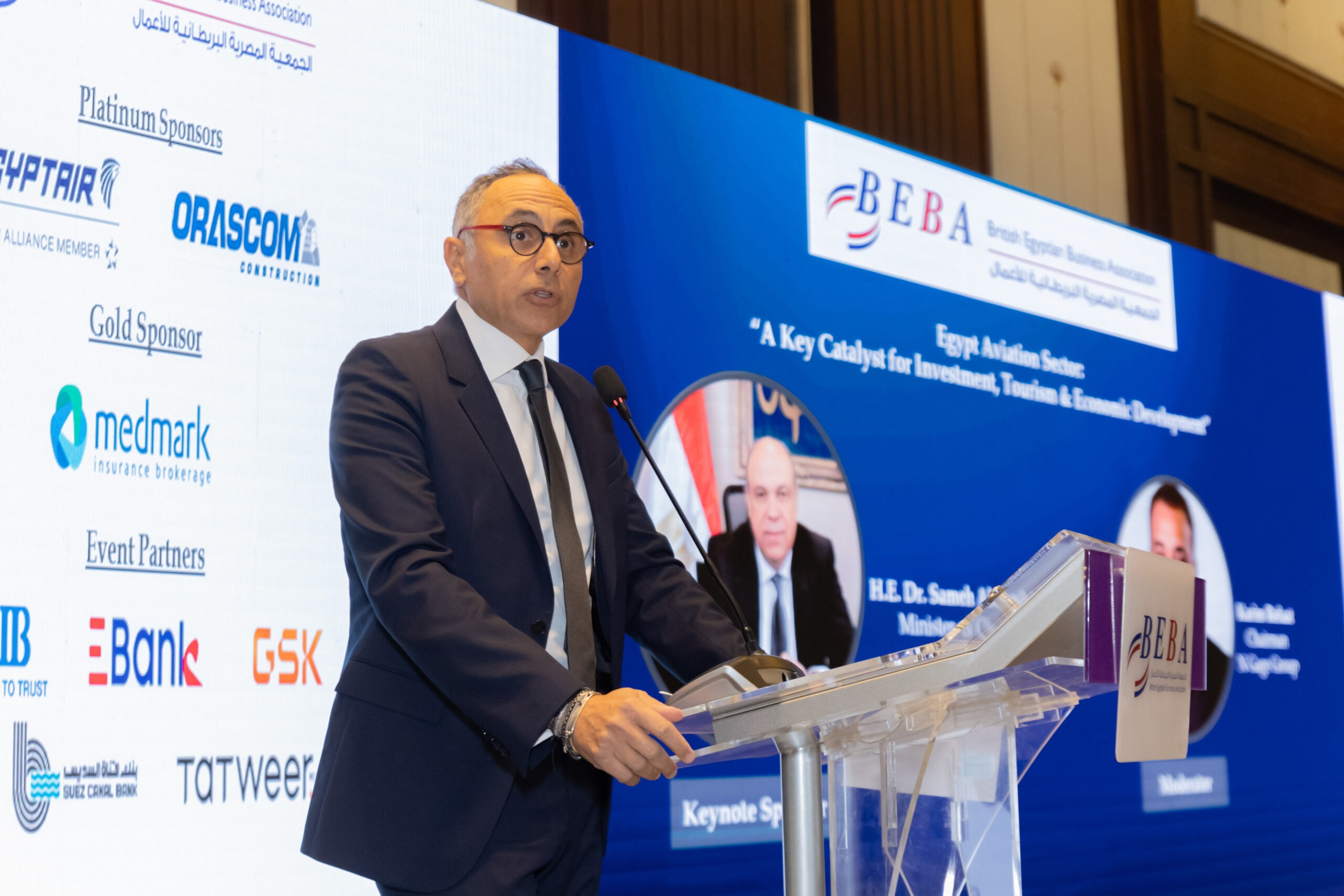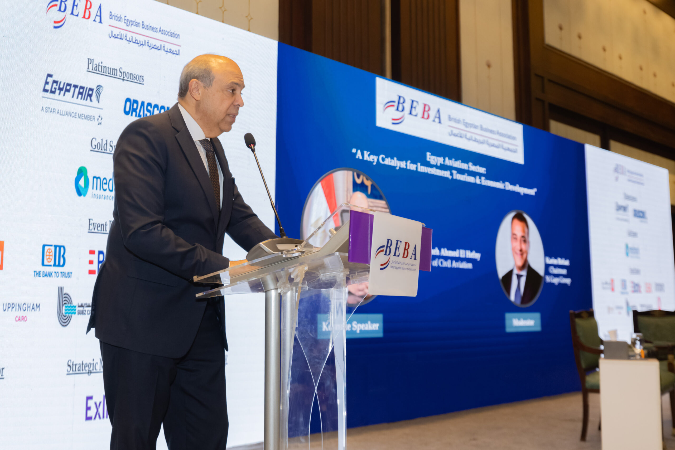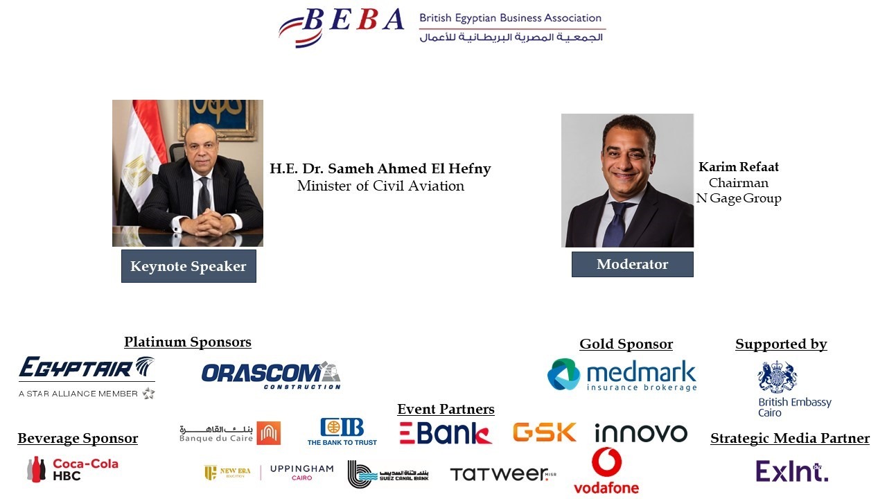 In his opening remarks, Eng. Khaled Nosseir, BEBA Chairman, welcomed the guests, notably H.E. Gareth Bayley, British Ambassador to Egypt; Pilot Montaser Manaa, Deputy Minister of Civil Aviation; Eng. Ayman Arab, Chairman of the Egyptian Holding Company for Airports and Air Navigation (EHCAAN); Eng. Yahia Zaki, Chairman of the Suez Canal Economic Zone; Eng. Yehia Zakaria, Chairman & CEO of EgyptAir Holding; and Pilot Mohamed Alian, CEO of EgyptAir. This in addition to representatives of the US and Turkish embassies to Egypt.