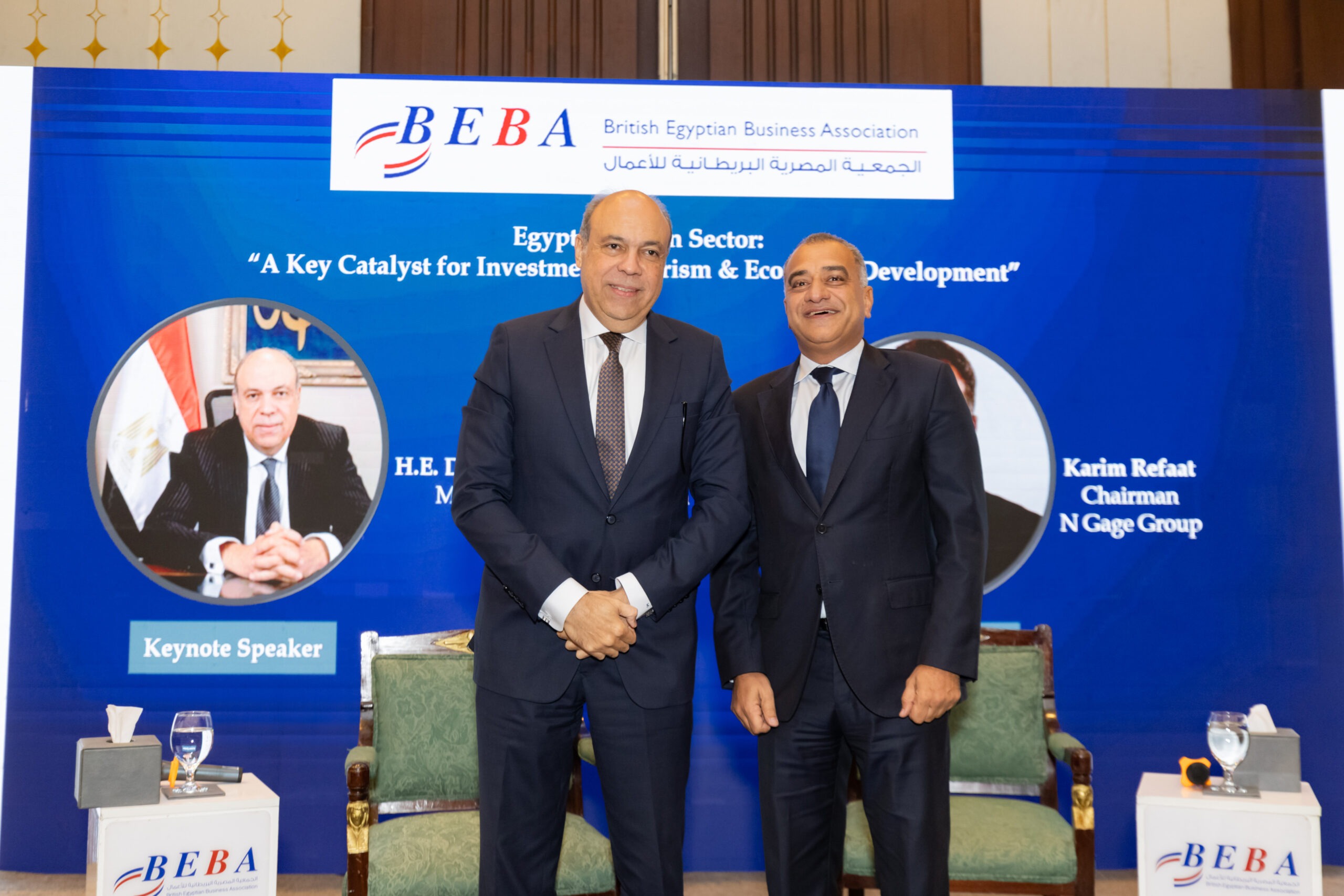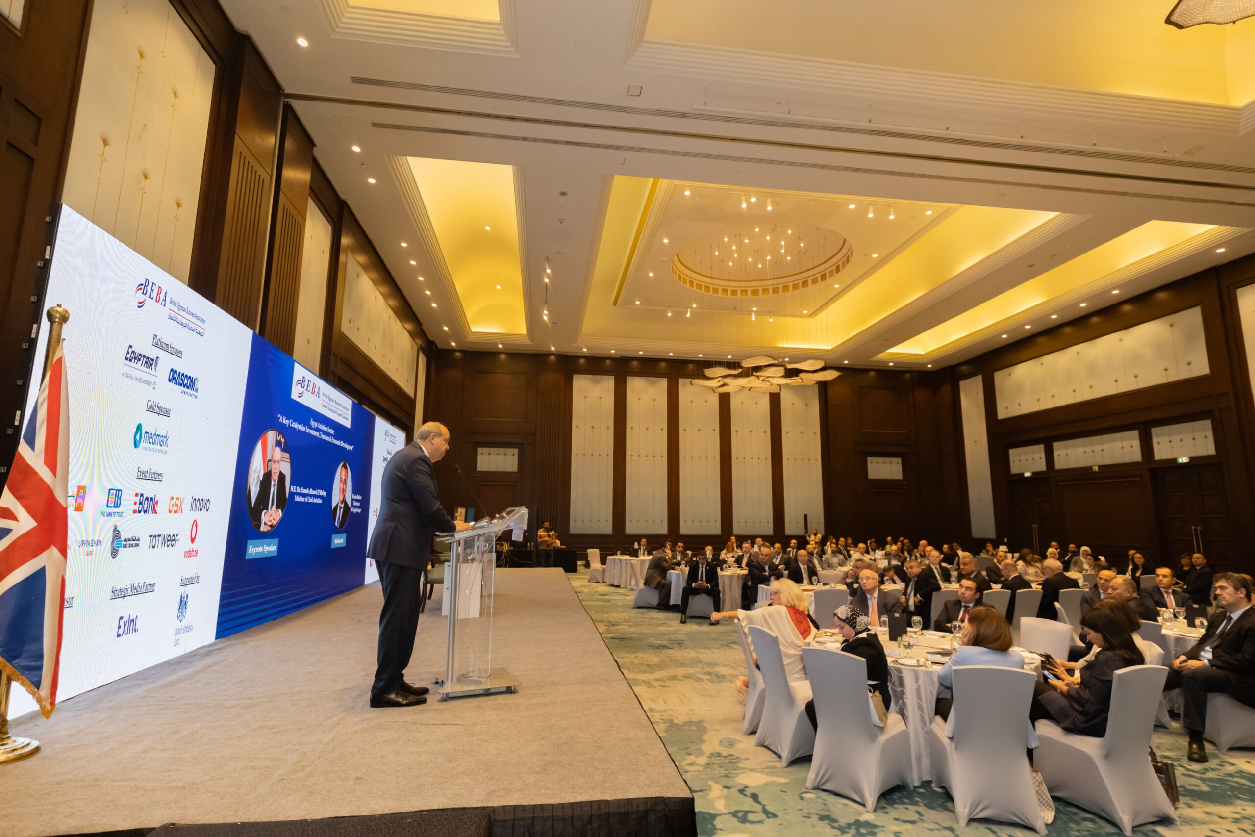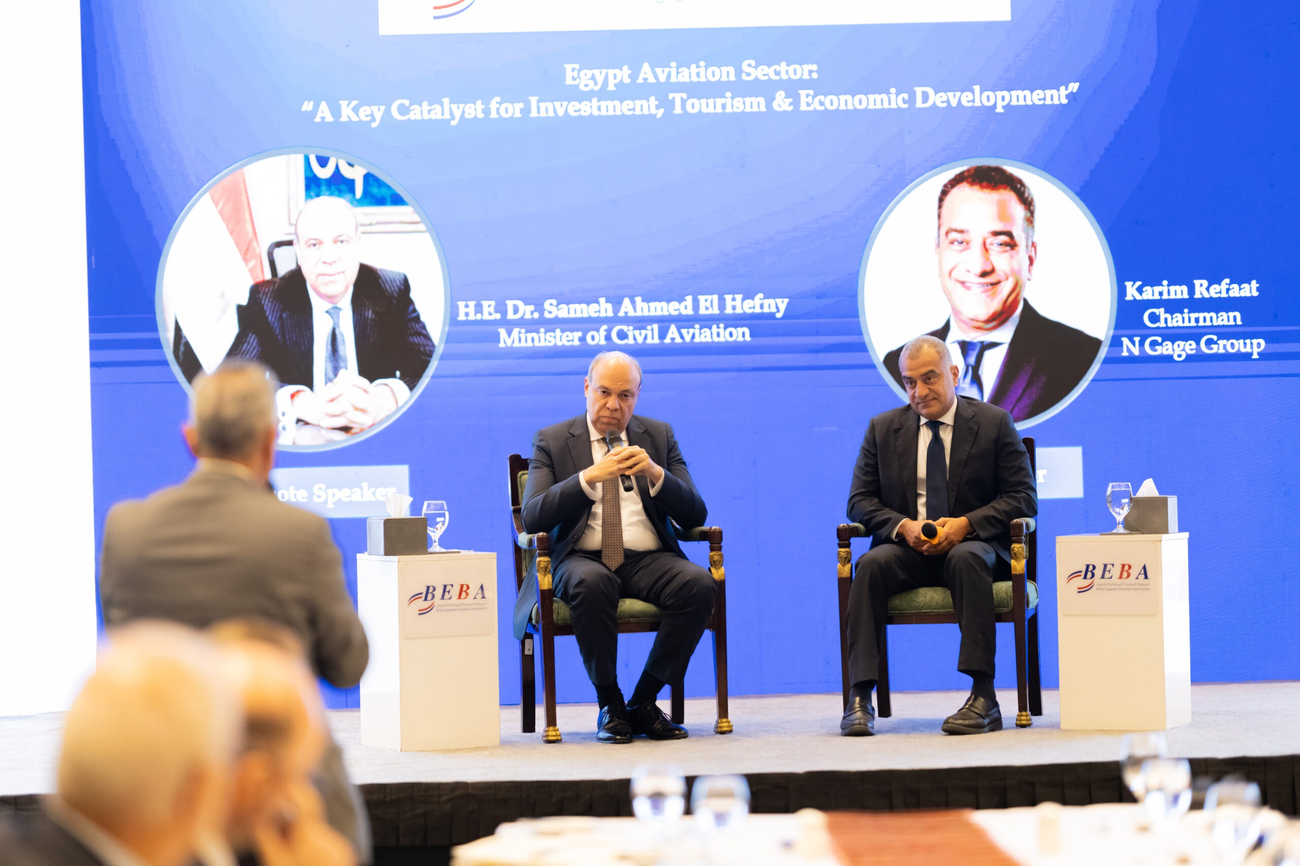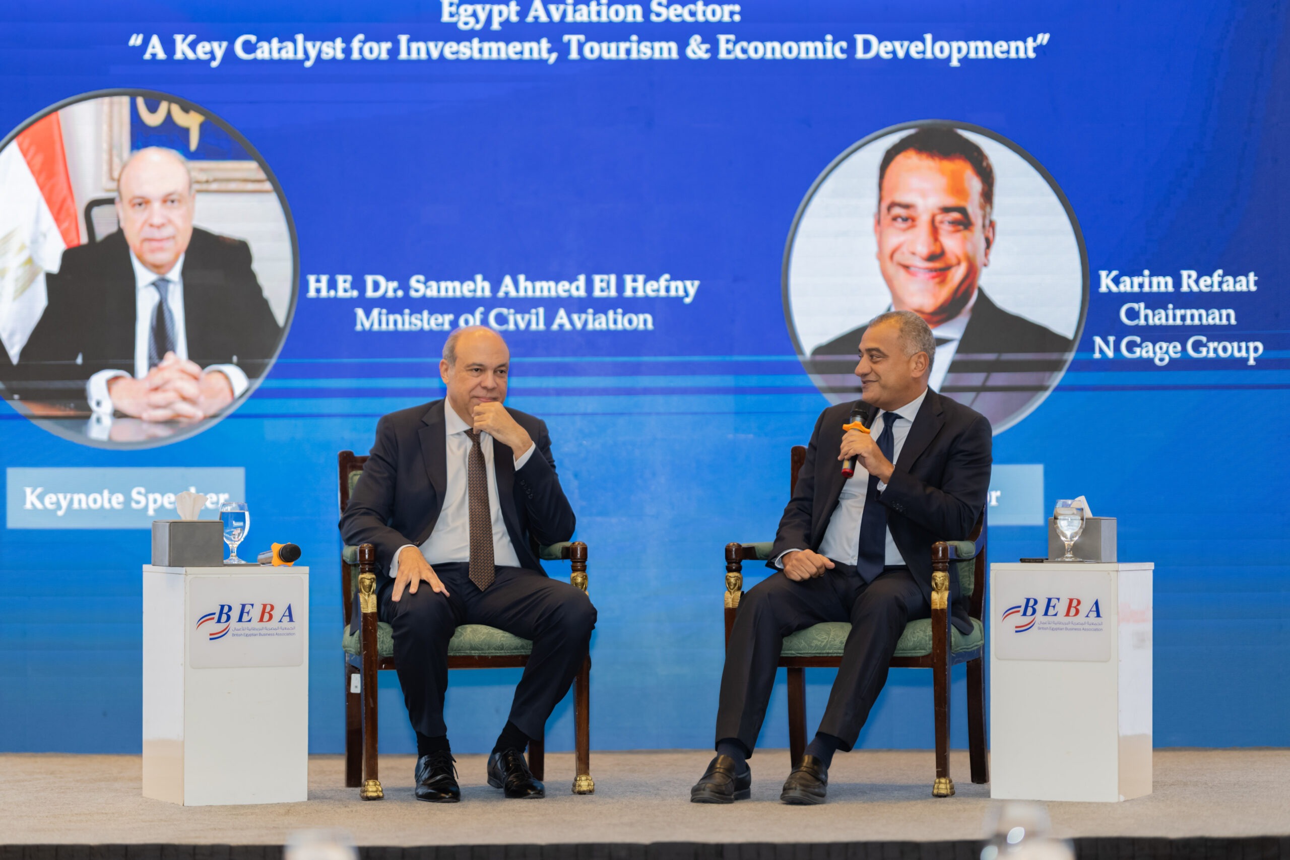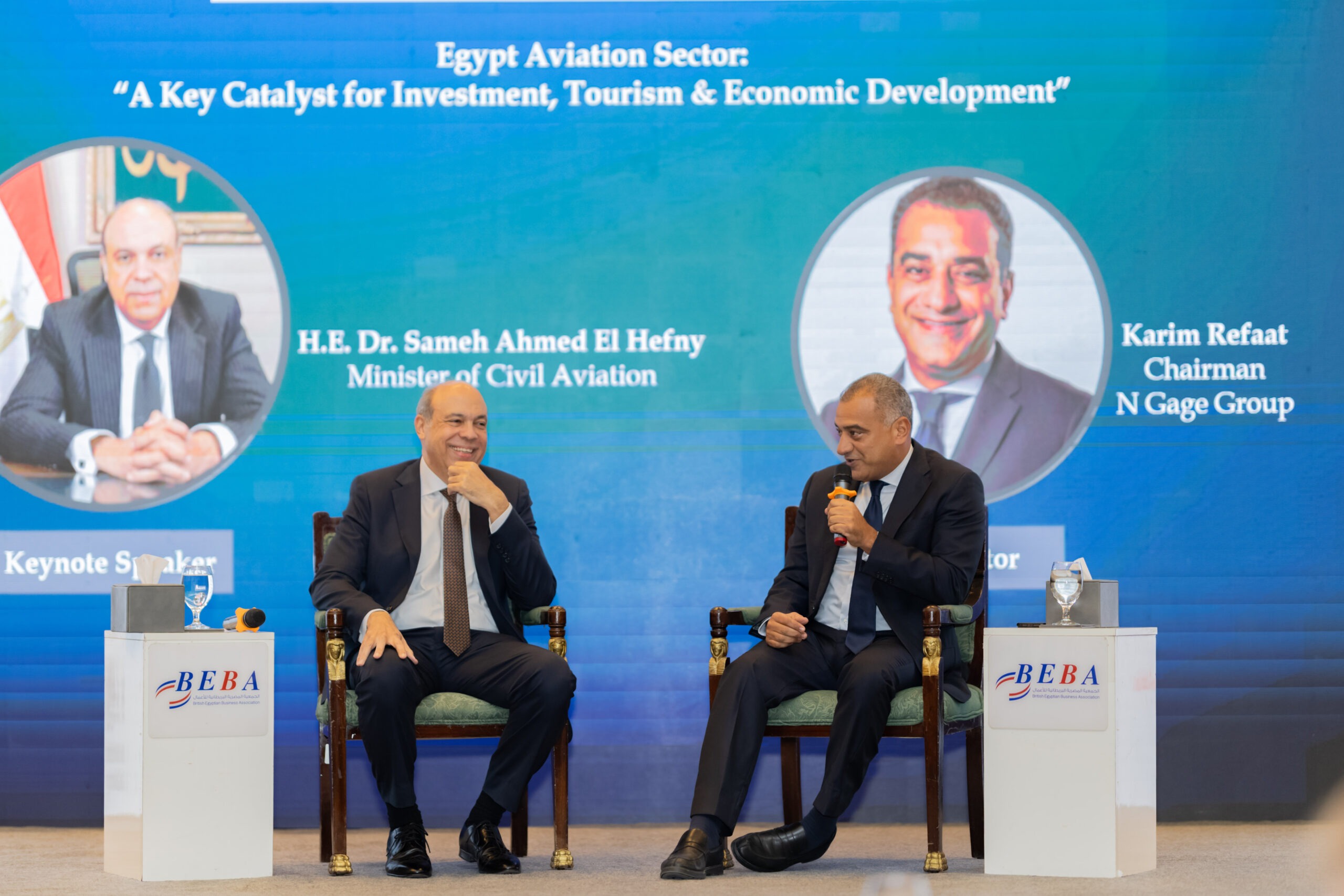 In his opening remarks, Eng. Khaled Nosseir, BEBA Chairman, welcomed the guests, notably H.E. Gareth Bayley, British Ambassador to Egypt; Pilot Montaser Manaa, Deputy Minister of Civil Aviation; Eng. Ayman Arab, Chairman of the Egyptian Holding Company for Airports and Air Navigation (EHCAAN); Eng. Yahia Zaki, Chairman of the Suez Canal Economic Zone; Eng. Yehia Zakaria, Chairman & CEO of EgyptAir Holding; and Pilot Mohamed Alian, CEO of EgyptAir. This in addition to representatives of the US and Turkish embassies to Egypt.